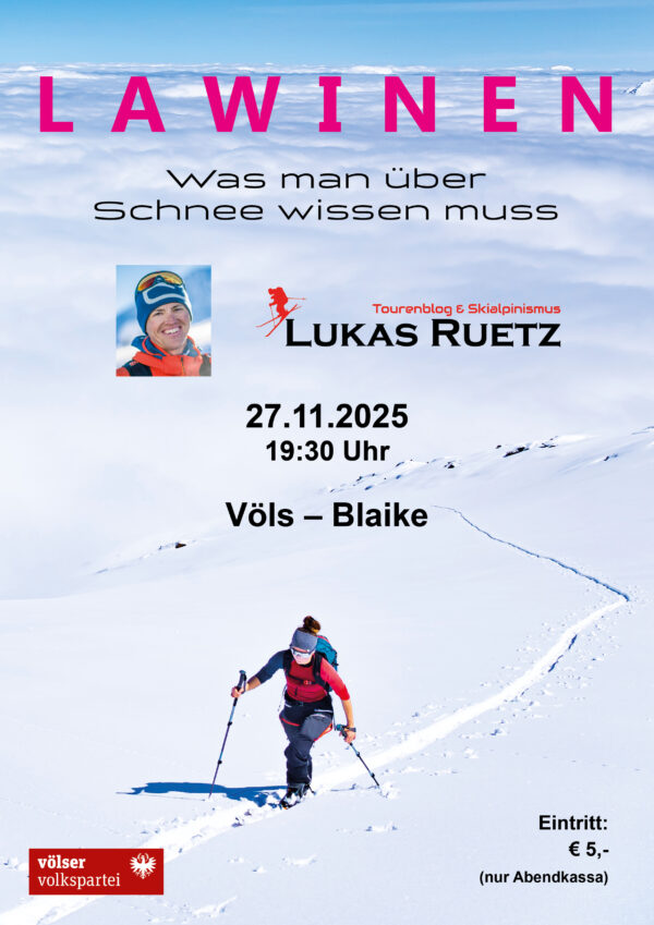 Bekannt durch seine ausgefallenen Skitouren beschäftigt sich Lukas Ruetz auch intensiv mit der angewandten Lawinenkunde und verarbeitet dies in der winterlichen Kolumne „Schneegestöber“. Inzwischen stellt er ein bekanntes Bindeglied zwischen Schneeforschung und der täglichen Praxis im Gelände dar.
