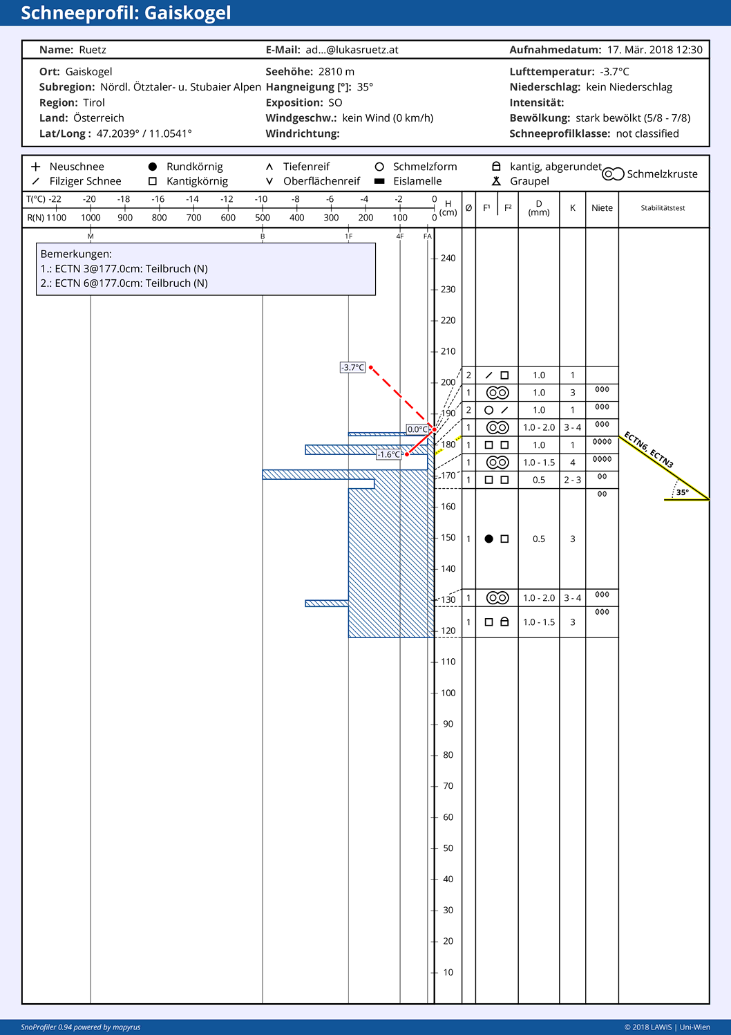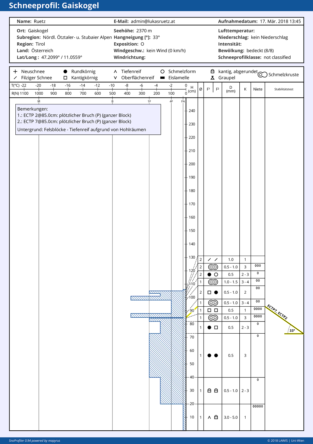 Anfang und Mitte März haben sich im Bereich von mehreren, dünnen Schmelzkrusten kleine, kantige Kristalle gebildet. Diese sind vor allem sonnseitig oberhalb von 2500m durchaus störanfällig – sofern ein gebundenes Schneebrett durch Wind oder Setzung durch die Strahlung über diesen Schichten liegt. Eine erhöhte Störanfälligkeit aufgrund dieser Schichten ist auch schattseitig in einem engen Höhenband um 2100m denkbar. Genauere Infos dazu findet man wie immer beim Lawinenwarndienst.