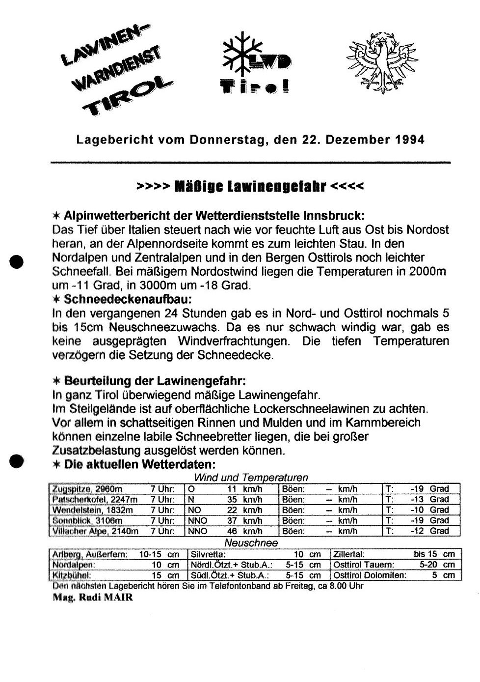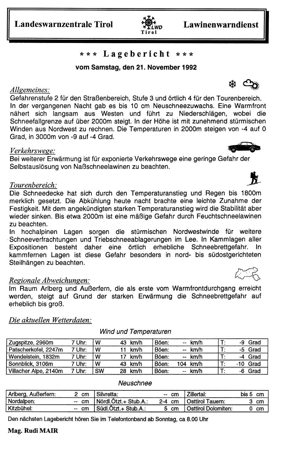 LR: Der LWD Tirol besteht also seit inzwischen 60 Jahren. Genau die Hälfte davon – seit 1990 – unter deiner Mitwirkung beziehungsweise unter deiner Leitung. Wie lief die Lawinenwarnung grundsätzlich in der Prä-Mair-Ära ab?