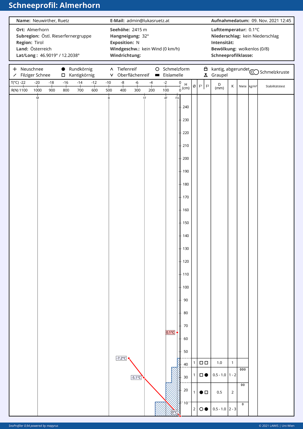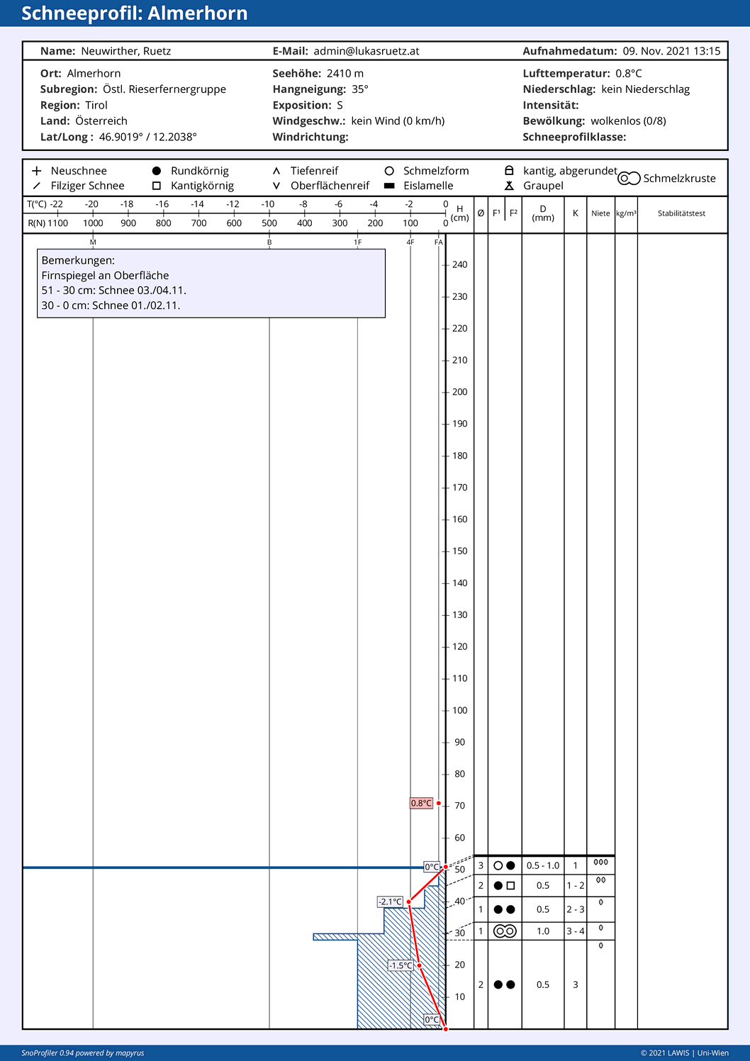 Die beiden Profile wurden auf 2400m aufgenommen. Der Schnee stammt erst von den Schneefällen Anfang November. Hochalpin, wo bereits Schnee von Anfang Oktober liegen geblieben ist, konnten sich die beschriebenen Prozesse in Schatten- wie Sonnenhängen bereits wesentlich länger austoben und damit problematische Schwachschichten bilden.