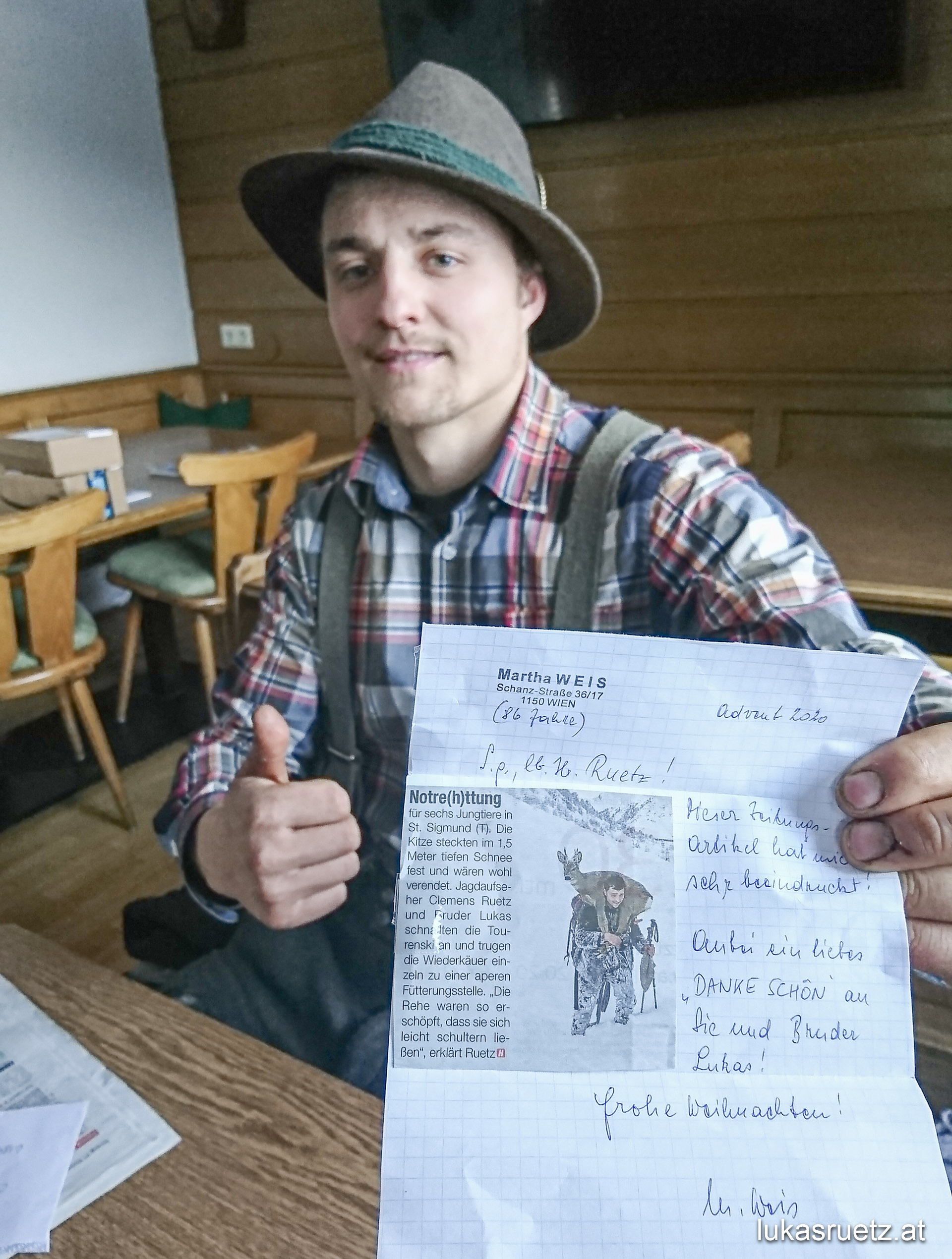 Neben den zigtausend Kommentaren und dutzenden Emails kamen einige Tage später sogar Briefe nachhause geflattert. Vor Weihnachten gab es noch einen ausführlichen Tirol Heute Beitrag im ORF zur Bergeaktion.
