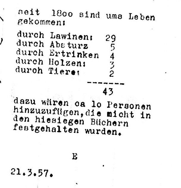 Im März 1957 wertet der damalige Pfarrer das Sterbebuch von St. Sigmund mit Beginn des Jahres 1800 aus und zählte in diesem Zeitraum 29 Todesopfer durch Lawinen – inklusive der „touristischen“ Opfer, also den Wintersportlern. Ab den 1920er-Jahren gab es – vor allem im Gleirschtal durch die Eröffnung der Pforzheimer Hütte – bereits einige Lawinenopfer beim Skitourengehen.