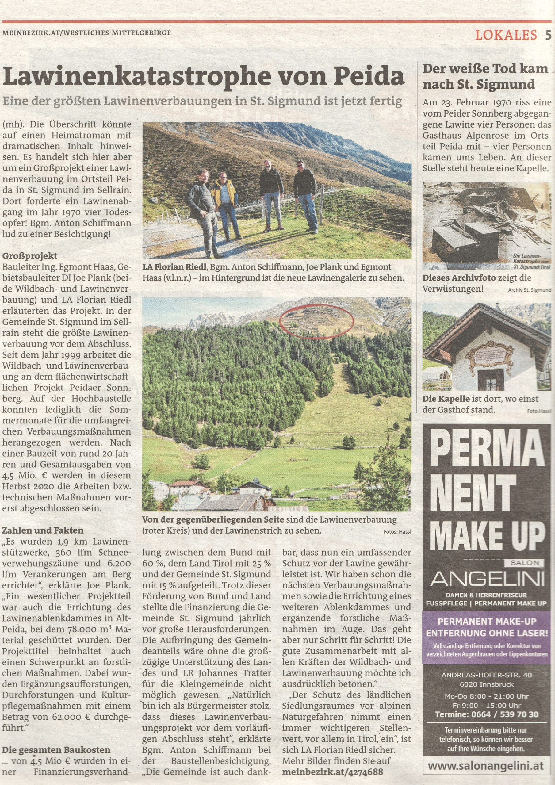 Schlussendlich dauerte es einige Jahre bis Lawinenabgänge auf den östlichen Bereich von Peida – wie in den Jahren 1935, 1951, 1956, 1970 – technisch möglichst abgewehrt werden konnten. Die Planung des bis dato letzten, großen Verbauungsprojektes im Sellraintal zum Lawinenschutz begann in den 1990er-Jahren, der Bau dauerte von 2000 bis 2021. Mehr dazu hier.